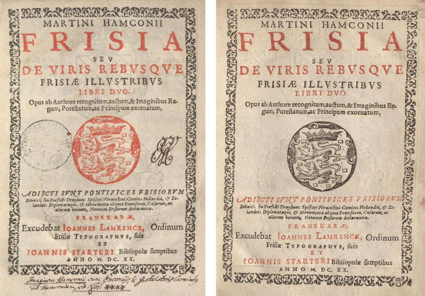 Darauf weist auch ein interessantes Indiz hin. Die Ausgabe der „Frisia“ von 1620 ist in mehreren Varianten erschienen. Bei einer ist die Widmung Hamckemas an das katholische Habsburger-Herrscherpaar von 1609 enthalten. Eine andere hat aber stattdessen ein Vorwort von Pierius Winsemius, gerichtet an die (republikanischen und reformierten) Deputierten der Provinz Friesland. Auch die in schwarz und rot gedruckten Titelblätter beider Varianten sind nahezu identisch, nur dass das friesische Wappen in einem Fall rot, im anderen Fall schwarz gedruckt ist. Offenbar war diese Neuausgabe für zwei verschiedene Zielgruppen vorgesehen. In der Landschaftsbibliothek in Aurich sind beide Varianten vorhanden – und dazu noch eine dritte, die beide Vorworte enthält. Eine letzte Ausgabe der „Frisia“ erschien 1623 in Amsterdam. Tatsächlich handelte es sich dabei aber nicht um eine echte neue Auflage, sondern um eine sogenannte Titelausgabe, bei der der Druck von 1620 ein neues Titelblatt bekam. Wahrscheinlich kaufte der Verleger aus Amsterdam die Restauflage auf und versah sie dann mit dem neuen Titelblatt. Auch diese Ausgabe ist in der Landschaftsbibliothek in Aurich vorhanden.